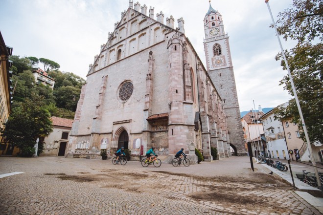 Auf der Kammlinie angekommen, ist die Aussicht, die sich uns eröffnet, phänomenal. Unter uns erstreckt sich ein gewundenes Tal, so weit das Auge reicht. Es ist voll von Apfelplantagen, Weinbergen und mit kleinen Dörfern übersät, deren Behausungen aus ihren winzigen Schornsteinen Rauchfahnen ausstoßen – jede einzelne ragt anmutig in die frostige Morgenluft. Wir sitzen still auf dem leeren Gipfel und nehmen die wahre Schönheit der alpinen Natur in uns auf. Wir halten lange genug inne, um die faszinierende Aussicht zu genießen. Dann, als die Kälte beginnt, sich in unsere erwärmten Körper zu schleichen, steigen wir wieder in die Pedale.