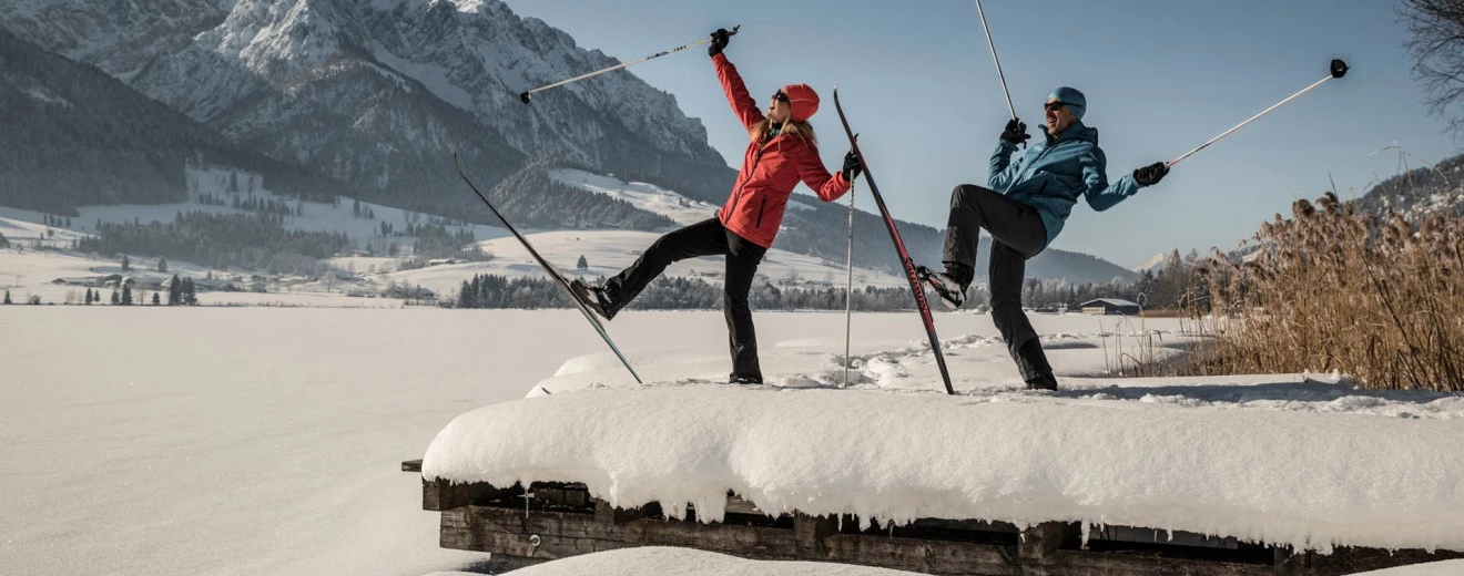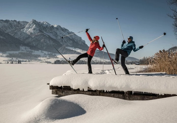 Aber jetzt gilt es vorerst den Rückweg anzutreten. Unsere Körperbewegungen erfolgen völlig im Takt, die Muskeln in den Beinen spannen sich im Rhythmus der Abstöße an, jeder Doppelstockschub powert uns in der Loipe nach vorne. Kraft, Beweglichkeit und Koordination werden auf Vordermann gebracht, der Schweiß ist der Preis für das Vergnügen. Beinahe lautlos gleiten wir durch dieses stille Paradies und spüren wie wir den Kopf frei bekomme, den Alltag hinter uns lassen und wir neue Energien tanken. Über die Schleife am Ostufer kommen wir wieder zurück zum Ausgangspunkt. Langlaufen macht Spaß! Erschöpft von dieser Trainingseinheit und der kalten Winterluft, schweifen meine Gedanken bereits zu den diversen Erholungseinrichtungen der Region ab. Wer Abwechslung sucht, wenn’s draußen stürmt und schneit oder als Entspannung nach dem Sport, im Kaiserwinkl und Umgebung gibt es zahlreiche Hallenbäder und Saunen mit den unterschiedlichsten Relax-Möglichkeiten. Zunächst eine Aufwärmrunde im Dampfbad, gefolgt von einem zischenden Saunaaufguss und zum Abschluss eine wohltuende Massage, um wieder fit für den nächsten Tag zu sein. Ich bin sicher, das ist nicht unser letzter Langlaufurlaub im Kaiserwinkl gewesen, denn mittlerweile finde ich wirklich Gefallen daran: einfach kaiserlich urlauben zu fairen Preisen.