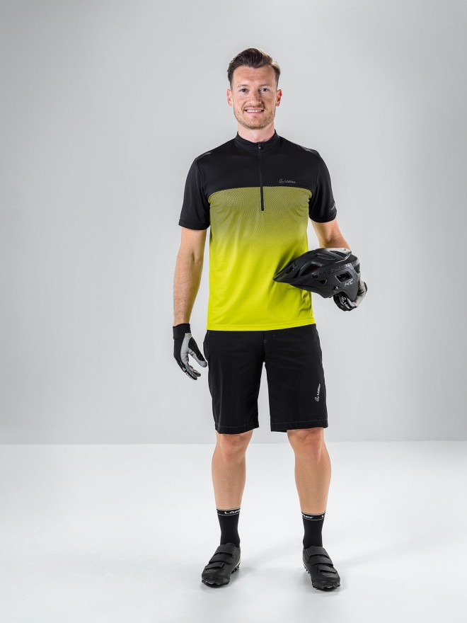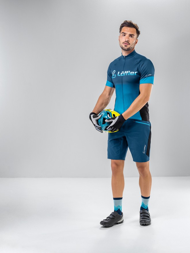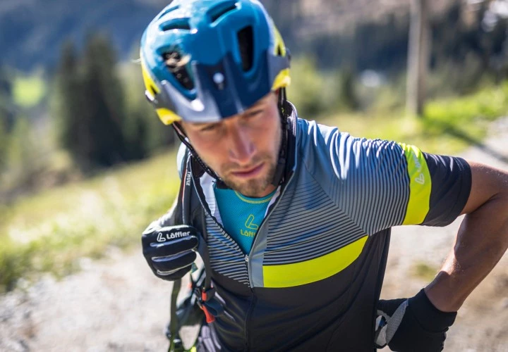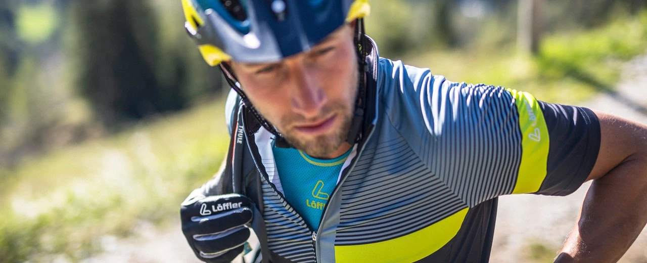Slim-fit bike jerseys are cut short and fit close to the skin. This means the more streamlined, the better. If you ride a lot of climbs in hot weather, there are special jerseys made of a lighter and very breathable fabric – for example the Bike Jersey FZ Aero. In addition, built-in structures (Airstream) in the sleeve and shoulder area ensure that the air flow is interrupted. This minimises air resistance in an aggressive racing position. LÖFFLER has created jerseys that fit like a second skin on the body and were developed with the help of the pros from Team Felbermayr Simplon Wels.