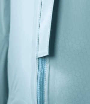 Der Flap über dem Front-Zip schützt vor Zugluft und Nässe. Auch verschweißte Nähte lassen Feuchtigkeit von außen keine Chance und ein Lüftungsschlitz im Rücken sorgt für ausreichend Ventilation.